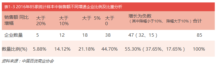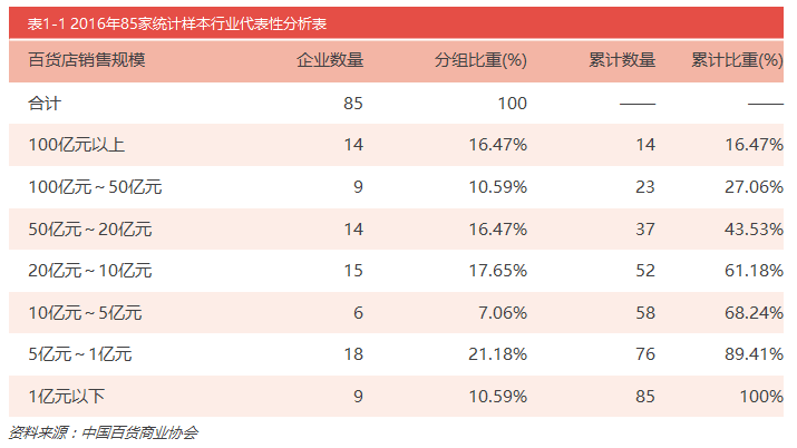 中國百貨商業協會采集匯總了部分(85家)會員單位的銷售統計數據,對2016年行業情況作了初步的統計 分析。統計樣本中的85家會員單位絕大多數是中國百貨零售行業的骨干企業,年銷售額規模在億元以上的企 業(集團)占89.41%,超過10億元的占61.18%,超過100億元的占16.47%。從銷售額占比看,樣本中52  家超10億元企業(集團)的市場規模占樣本整體銷售額的98.55%,14家超100億元企業的市場規模占整體 規模的79.31%。這些企業的經營狀況可以基本反映年度行業運行實際情況,該項統計具有行業典型代表性(見表1-1)。