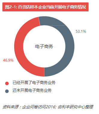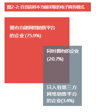 根據中國百貨商業協會及利豐研究中心的調查i發現,46.9%的受訪企業已經開展了電子商務業務 (見圖2-1)。其中,75.9%的企業擁有自建網絡銷售平臺,20.7%的企業同時擁有自建網絡銷售平臺及入駐第三方網絡銷售平臺(見圖2-2),只入駐第三方網絡銷售平臺的企業只有3.4%。