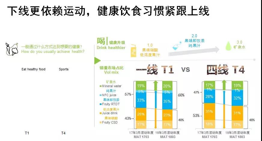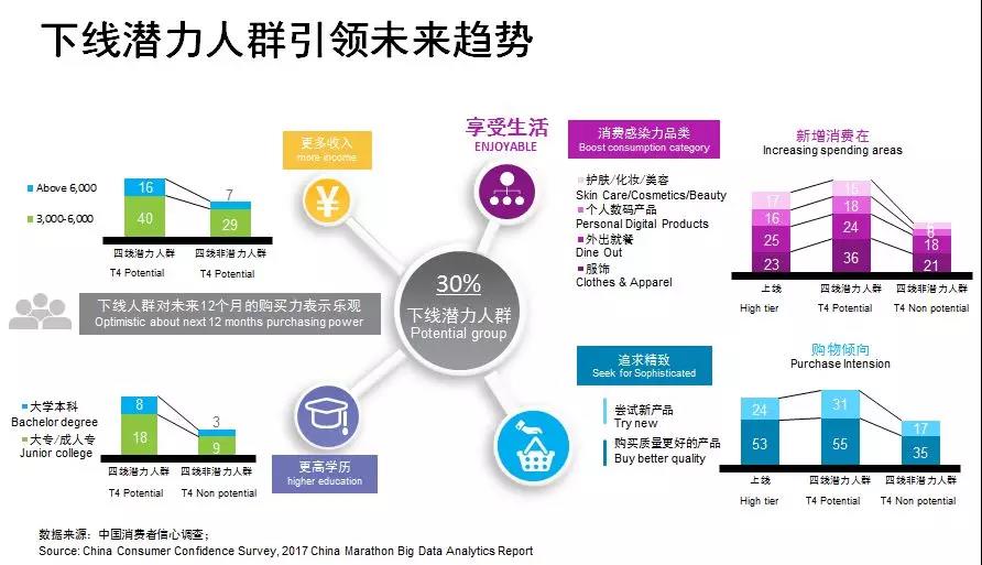 三四線城市消費者在收入和教育水平上和一線存在差距,但消費上呈現高潛力,一線城市消費者則呈現消費回歸理性的傾向,三四線在享受健康生活緊追一線,得益于三四線城市的超級消費者去感染帶動周邊的非潛力人群,推動下線整體。