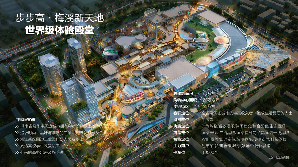 步步高梅溪新天地總建筑面積70萬平方米,購物中心面積20萬平方米,步行街區10萬平方米,停車位超過10000個。于2016年6月25日盛大開業,當天客流超過80萬,48小時內客流150萬。