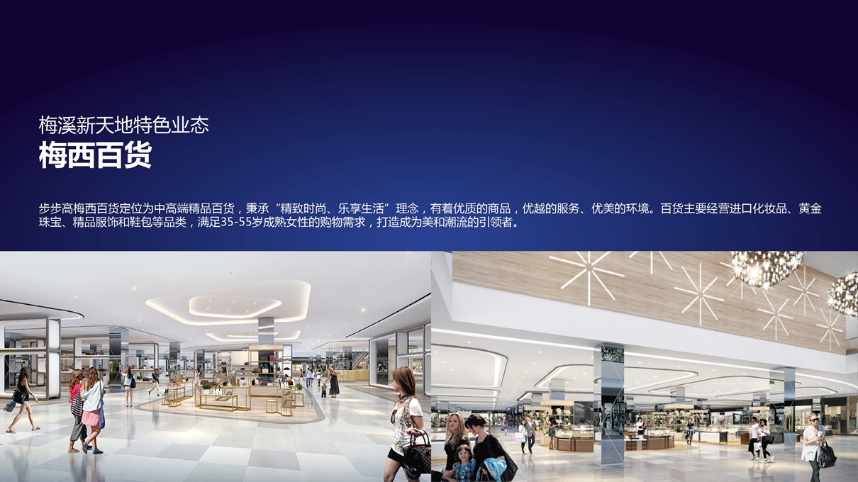 定位中高端精品百貨,秉承“精致時尚、樂享生活”的理念,以優質的商品、優越的服務、優美的環境,以經營進口化妝品、黃金珠寶、精品服飾和鞋包等品類,滿足35-55歲女性的購物需求,打造成為美和潮流的引領者。
