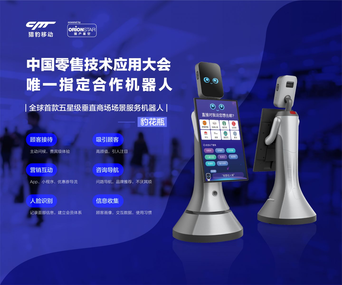 商場作為與用戶接觸高頻的消費場景,必將成為人工智能介質的一大入口。獵豹移動以商場服務機器人“豹花瓶”為載體,用AI賦能新零售打造智慧商業的方式將有效為商場優化運營,降低成本,提升服務,探索新零售領域的顛覆性變革。