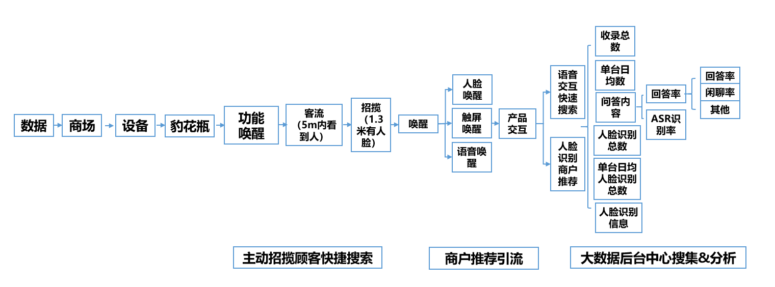 與目前商場普遍使用的廣告屏相比,“豹花瓶”實現了傳統廣告屏和交互屏的完美融合,拉近了商家和用戶的距離感,顧客進入商場后,“豹花瓶”通過人臉識別和語音交互主動接待用戶,通過交互屏提供詳細的搜索菜單為客戶進行查詢,并根據喜好提供個性化推薦,最后提供優惠券引導用戶進店消費,互動過程中,極大提高了大屏上的輪播廣告的曝光率。