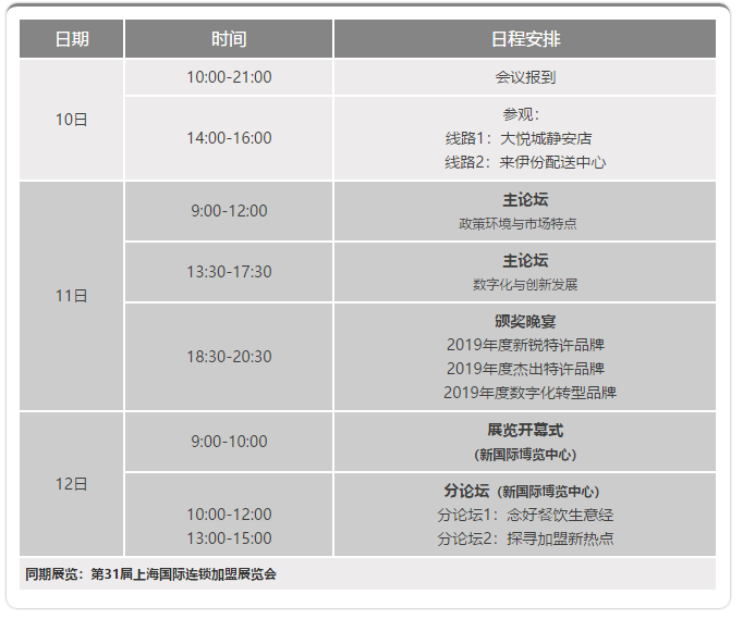 展會(huì)還將攜手中國(guó)百貨商業(yè)協(xié)會(huì)和中國(guó)連鎖品牌聯(lián)盟(籌),于2019年11月11日在上海上海喜馬拉雅酒店舉辦“數(shù)字化時(shí)代的品牌傳承與創(chuàng)新——2019中國(guó)商業(yè)特許經(jīng)營(yíng)大會(huì)”及平行論壇,邀請(qǐng)500+特許經(jīng)營(yíng)企業(yè)高層及專業(yè)投資加盟商,從政策走向、市場(chǎng)變化、數(shù)字化運(yùn)用和品牌創(chuàng)新等角度,全面解讀在數(shù)字化時(shí)代的背景下,如何實(shí)現(xiàn)品牌的傳承與創(chuàng)新。此外,大會(huì)還將舉辦“2019年度新銳特許品牌”、“2019年度杰出特許品牌”和“2019品牌數(shù)字化杰出表現(xiàn)獎(jiǎng)”等三大獎(jiǎng)項(xiàng)評(píng)選活動(dòng)。