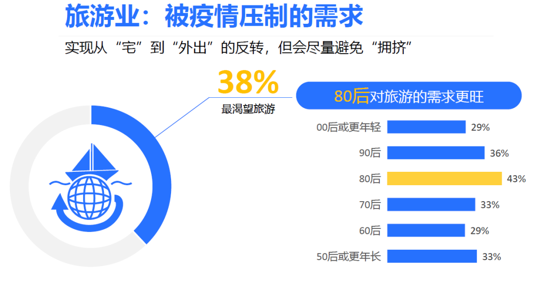 80后對(duì)離開(kāi)家去旅行的需求旺盛;50后表現(xiàn)為周邊游機(jī)會(huì)點(diǎn)