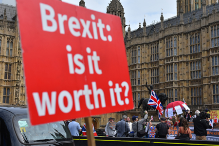 兩年前,一場聲勢浩大的“脫歐”公投讓英國飛出了一只“黑天鵝”,而今,距離2019年3月29日“脫歐”的最后期限僅剩半年,英歐雙方不僅沒能和談,麻煩卻不減反增。英國工黨二次公投的聲音甚囂塵上,首相特雷莎·梅的契克斯計劃又遭群嘲,倫敦金融城的地位也在“脫歐”迷霧中搖搖欲墜。半年倒計時的鐘聲已經敲響,誰也無法預料英國最后將以怎樣的姿勢“脫歐”。