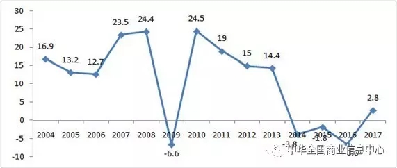 圖表 1  2004-2017年春節黃金周全國百家重點大型零售額同比增速(%)