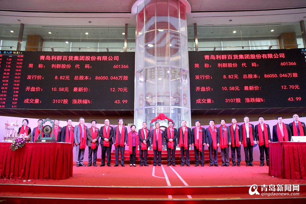 (轉)青島新聞網4月12日訊(記者 孫璐璐)今天,青島利群百貨集團股份有限公司(證券簡稱“利群股份”,證券代碼:601366)正式在上海證券交易所隆重掛牌上市!上市首日,開盤漲幅封頂漲停44%!中國商業聯合會會長姜明,中國連鎖經營協會會長郭戈平,中國百貨商業協會會長楚修齊,青島市委常委、青島西海岸新區工委書記、黃島區委書記王建祥,青島市政府副秘書長萬建忠,青島市金融辦公室主任白光昭等參加了利群股份上市掛牌儀式。