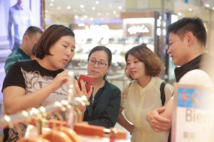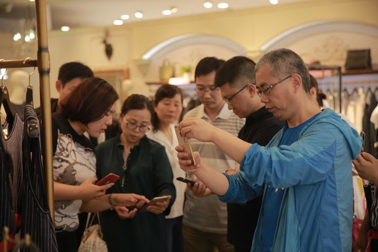 圖為企業(yè)代表們在賣場親自操作、感受線上線下互動帶來的購物體驗