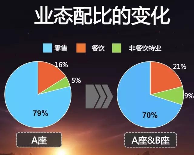 經過整改之后,新百業態呈現出的變化是,原有零售業態能占到新百79%,飲與非餐飲業僅占到21%,但A座與B座互為補充發展后,零售業態占比僅為70%,餐飲占比增加至21%,非餐飲特業占比增加至9%。