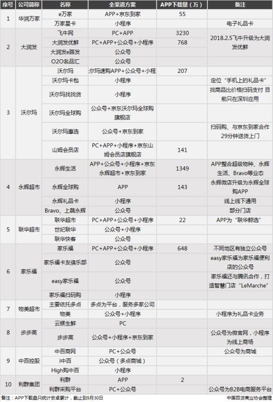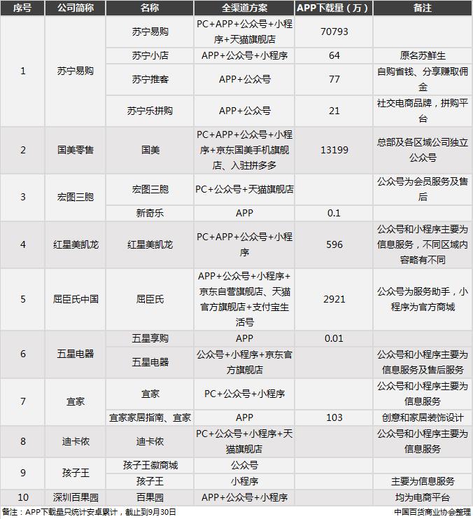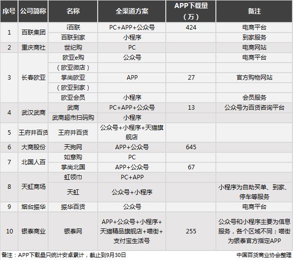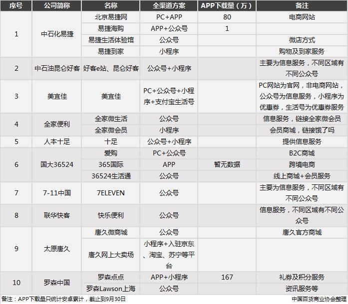 為便于比較分析,分別選取了百貨、超市、便利店、專業(yè)店四個(gè)業(yè)態(tài)的主要10家企業(yè),研究其目前的全渠道方案。