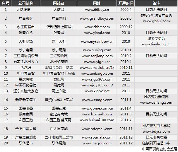 實(shí)體零售開展網(wǎng)絡(luò)零售業(yè)務(wù)真正起步是在2010年前后,不完全統(tǒng)計(jì),在2009-2011年間有20家具有一定規(guī)模的零售商開通了電商網(wǎng)站。20家企業(yè)中,有5家網(wǎng)站已無(wú)法訪問,4家域名變更,1家無(wú)電商功能,1家鏈接到天貓平臺(tái)。2012年,主要100家零售商中,有62家開展了PC電商業(yè)務(wù),目前剩余不到一半。