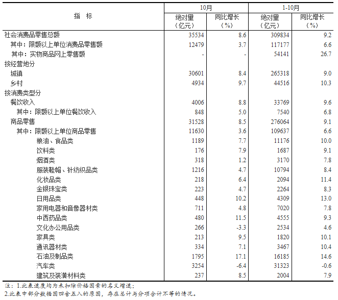 按經(jīng)營(yíng)單位所在地分,10月份,城鎮(zhèn)消費(fèi)品零售額30601億元,同比增長(zhǎng)8.4%;鄉(xiāng)村消費(fèi)品零售額4934億元,增長(zhǎng)9.7%。1-10月份,城鎮(zhèn)消費(fèi)品零售額265318億元,同比增長(zhǎng)9.0%;鄉(xiāng)村消費(fèi)品零售額44516億元,增長(zhǎng)10.3%。