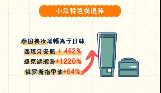 首先,有特色的小眾品牌具備了明星潛質(zhì)。比如說,一提到美妝品牌,我們第一個(gè)想到的是美日韓等國(guó)的知名品牌,但白皮書顯示,西班牙的安瓶增長(zhǎng)高達(dá) 462%、捷克的遮瑕膏增長(zhǎng)1220%、俄羅斯的指甲油增長(zhǎng)達(dá)64。小眾品牌“逆襲”起來原來這么恐怖?