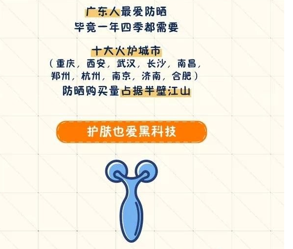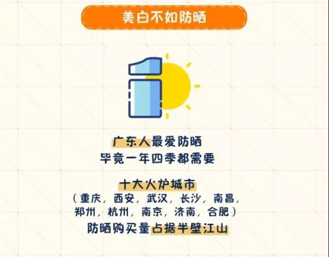 還有,美白不如防曬。白皮書顯示,廣東人最愛防曬,畢竟因?yàn)闅夂蛟颍瑥V東人一年四季“不可一日無此君”;同理,十大火爐城市(重慶、西安、武漢、長(zhǎng)沙、南昌、鄭州、杭州、南京、濟(jì)南、合肥)也理所當(dāng)然地占據(jù)了防曬購(gòu)買量的半壁江山。