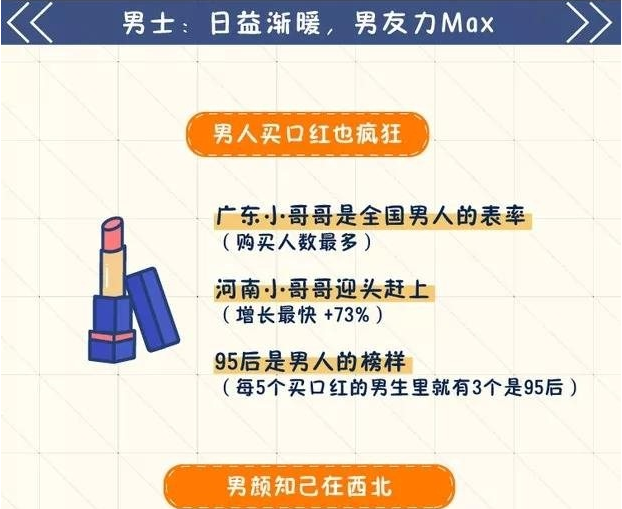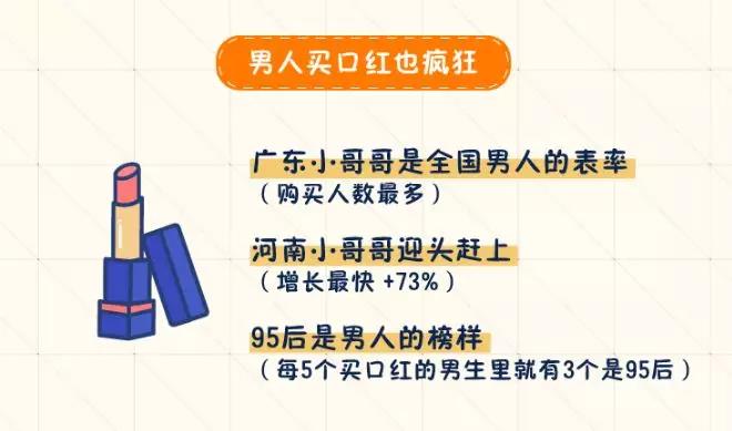 萬萬沒想到,男人買起口紅也一樣瘋狂!其中廣東小哥哥最愛購(gòu)買口紅,堪稱全國(guó)男人之表率;河南小哥哥以73%的增長(zhǎng)在后面緊追;而每5個(gè)買口紅的男生里就有3個(gè)是95后,95后真是實(shí)力寵女友!