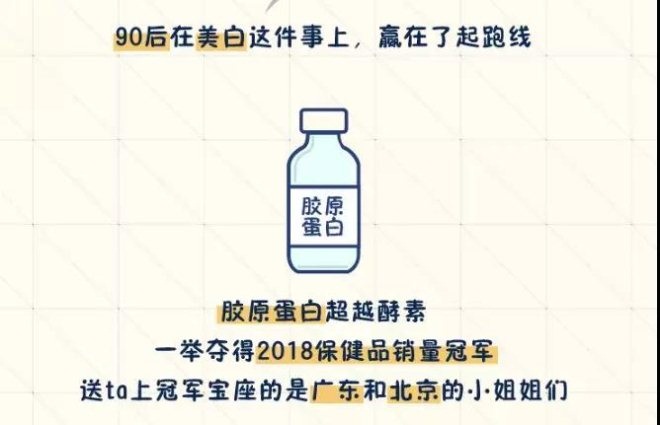 而膠原蛋白也超越了酵素,一舉多得了2018年保健品銷量冠軍,90后尤其喜歡購(gòu)買這類產(chǎn)品。這也難怪,在美白這件事上,承前啟后、繼往開來的90后當(dāng)然會(huì)贏在起跑線上。