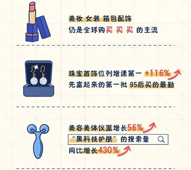 第三,美妝、女裝、箱包配飾仍是全球購(gòu)買買買的主流。