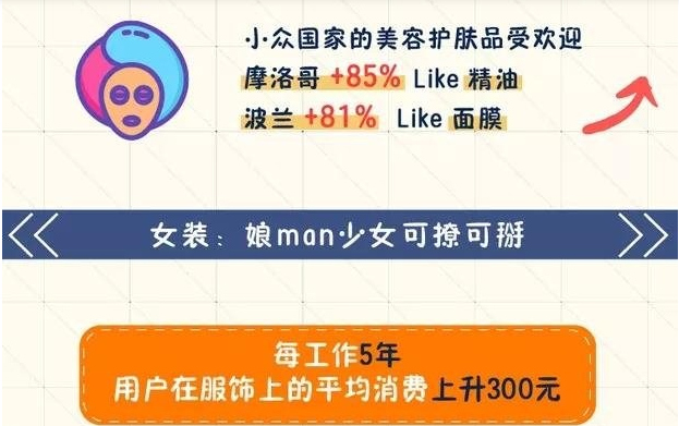 其次是小眾國(guó)家表現(xiàn)不俗。摩洛哥的美妝類同比增長(zhǎng)85%,最受歡迎的是精油,波蘭的美妝類同比增長(zhǎng)81%,最受歡迎的是面膜。誰又能想到泰國(guó)美妝增長(zhǎng)居然高于日韓?