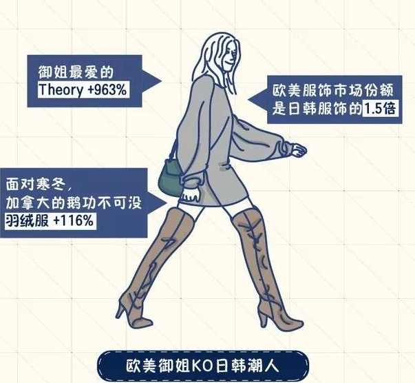 海淘女裝風(fēng)格上,歐美御姐風(fēng)完勝日韓潮人風(fēng)。統(tǒng)計(jì)顯示,今年海淘歐美服飾的市場(chǎng)份額是日韓服飾的1.5倍,其中,御姐最愛的Theory 增長(zhǎng)高達(dá)963%。
