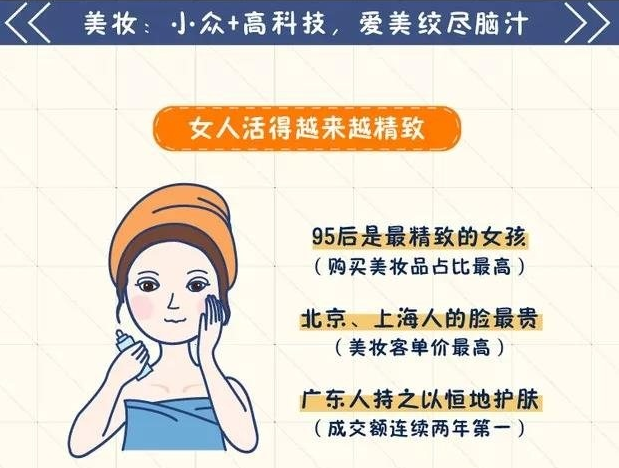 首先,女性消費(fèi)者特別是95后,在購(gòu)買美妝品上一點(diǎn)都不手軟。其中,北京、上海人花在美妝上的客單價(jià)最高,看來,“帝都”和“魔都”不僅房子貴,臉也是最貴的;而廣東人連續(xù)兩年奪得成交額之冠,喜獲持之以恒護(hù)膚獎(jiǎng),中國(guó)第一富省果然名不虛傳。而且,人們的化妝技巧也越來越好,比如說高光同比增長(zhǎng)了115%,而隨著女人對(duì)美妝的需求越來越旺盛,美妝品類的銷量也讓人嘆為觀止:2018年全球購(gòu)的面膜的銷量連起來可繞地球5.5圈。