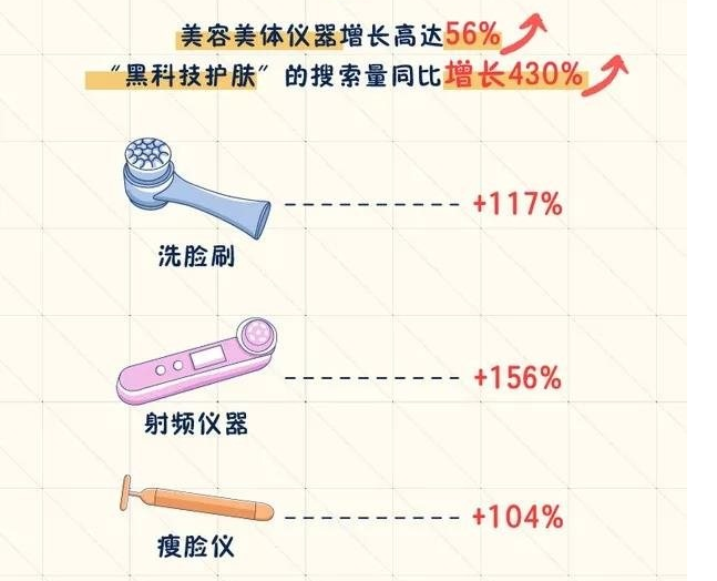 白皮書顯示,今年美容體儀器的增長(zhǎng)高達(dá)56%,其中洗臉?biāo)⒃鲩L(zhǎng)117%,射頻儀器增長(zhǎng)156%,瘦臉儀增長(zhǎng)104%,這些產(chǎn)品都自帶科技屬性。