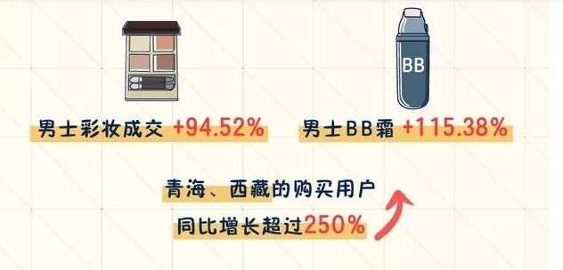 除了口紅外,男人們的最愛還有包包和彩妝。“一言不合就買包包”讓今年男士包袋類購(gòu)買增長(zhǎng)高達(dá)95%;彩妝方面,西北地區(qū)的男士彩妝成交同比增長(zhǎng)94.52%,男BB霜同比增長(zhǎng)115.38%,青海、西藏的購(gòu)買用戶同比增長(zhǎng)超過250%,原來“男顏知己在西北”啊。
