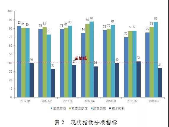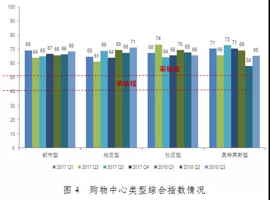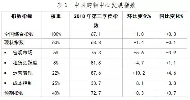 2018年第三季度中國購物中心綜合指數(shù)錄得67.1,環(huán)比上升1.0,同比上升0.3,且高出榮枯線17.1。整體市場保持健康向上的態(tài)勢。
