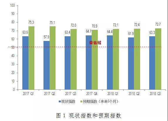 其中,現(xiàn)狀指數(shù)為63.3,環(huán)比上升1.4,同比微跌0.1,高出榮枯線13.3。季度環(huán)比下,現(xiàn)狀指數(shù)出現(xiàn)明顯回升,受益于整體消費市場的平穩(wěn)增長。三季度,社會消費品零售總額月度增速在9.0%上下波動,較二季度波幅逐漸收窄,并呈現(xiàn)穩(wěn)步回升的趨勢。但與去年同期增速相比,仍然減緩1.1個百分點,使得現(xiàn)狀指數(shù)同比輕微下滑。