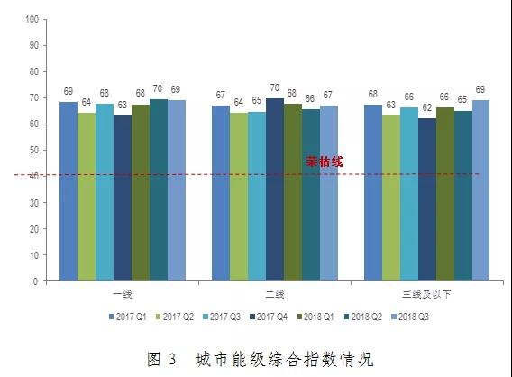 2018年第三季度,分城市能級指數(shù)表現(xiàn)略有不同。其中:一線城市綜合指數(shù)為69.1,環(huán)比下降0.4,但同比上升1.4。成本的上升是使得一線城市指數(shù)下降的原因。但一線城市在運營能力指標上仍表現(xiàn)突出:100%的一線城市錄得租金收入的增長,且有88%的項目實現(xiàn)銷售同比增速的提升。二線城市指數(shù)為67.2,環(huán)比上升1.3,同比上升2.3。二線城市中,有94%的項目本季度實現(xiàn)客流量的環(huán)比增長。三線及以下城市為69.1,環(huán)比上升3.9,同比上升2.7。
