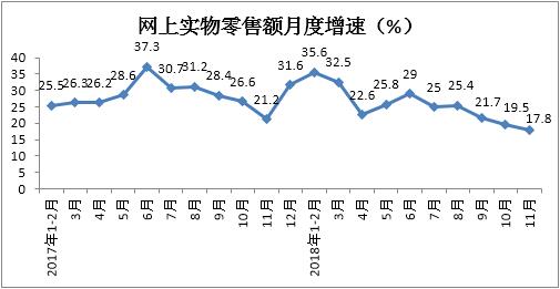 二、1-11月份網上實物商品零售額增速累計增長25.4%,月度增速持續(xù)三個月放緩