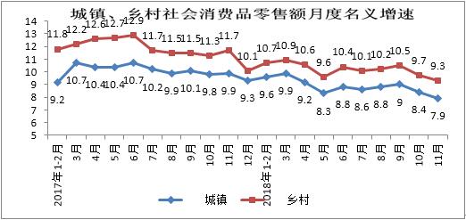 五、1-11月份城鄉(xiāng)消費品市場增速較上月均放緩,鄉(xiāng)村增速相對較快