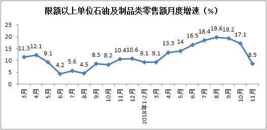 1-11月份,限額以上單位石油及制品類零售額同比增長14%,增速較1-10月份放緩0.6個百分點。拉動社會消費品零售總額增長0.69個百分點。其中,11月份同比增長8.5%,增速較上月大幅放緩8.6個百分點。