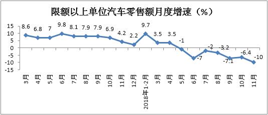 1-11月份,限額以上單位汽車類零售額同比下降1.6%,降幅較1-10月份擴大1個百分點。其中,11月份同比下降10%,自5月份以來,增速連續(xù)同比負增長。
