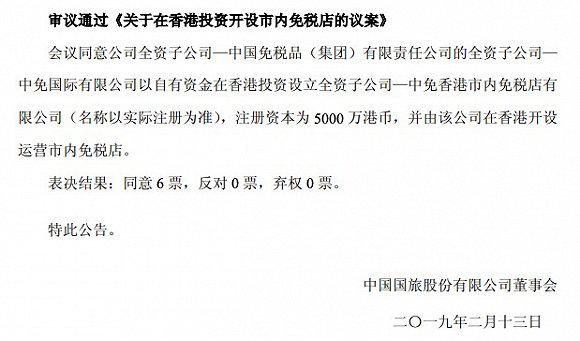 公告顯示,公司公告董事會審議同意在香港開設(shè)運營市內(nèi)免稅店,旗下公司中免國際有限公司(以下簡稱“中免公司”),將以自有資金5000萬港幣新設(shè)立中免香港市內(nèi)免稅店有限公司(名稱以實際注冊為準),新的香港市內(nèi)免稅店將由中免香港市內(nèi)免稅店有限公司負責(zé)開設(shè)和運營。