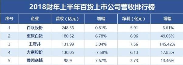 上市百貨企業(yè)中,2018年上半年營收總額約2141億元,比2017上半年同期增長2.26%,凈利潤總額69.19億元,比2017年同期的94.66億元下降26.91%。