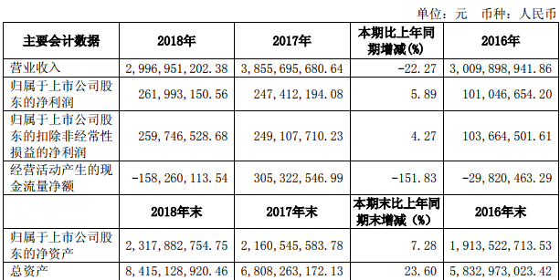 根據(jù)公告,2018年東百集團實現(xiàn)營業(yè)收入29.97億元,同比下滑22.27%;歸屬于上市公司股東的凈利潤為2.62億元,同比增長5.89%。