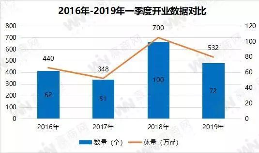 2019年一季度,全國購物中心開業熱度對比去年大幅放緩,在1月份集中開業后,2、3月份進入低谷期。