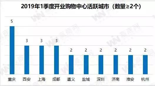 從單個城市看,一季度開業量活躍城市(數量≥2)共10個,重慶以5個居榜首,上海、西安、成都并列第二,各有3個項目。深圳、杭州、遵義、鹽城、濟南、淮安6個城市各有2個項目。活躍的十個城市,一線城市僅2個,二線城市5個,三線城市2個,四線城市1個。