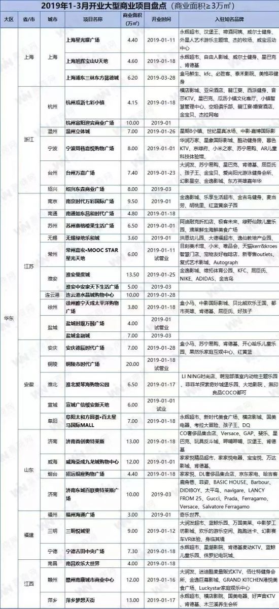 據贏商網統計,2019年1-3月份,全國開業購物中心項目約72個,商業總體量約532萬平方米。