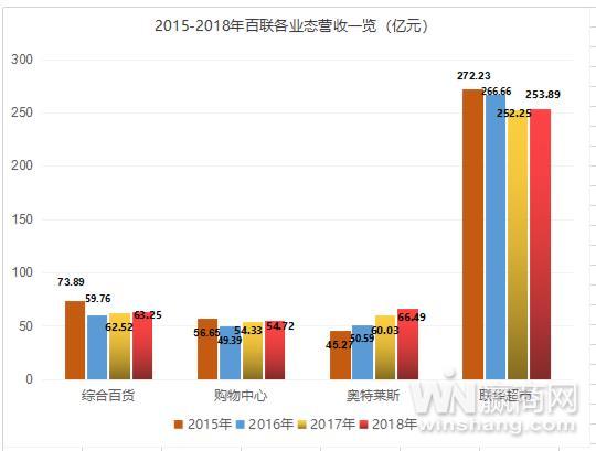 2018年營收整體上揚背景下,百聯旗下各業務版塊營收也實現全線飄紅。具體從百貨、購物中心、奧特萊斯、聯華超市4大業務板塊來看,贏商網注意到,其中綜合百貨2018年實現營收63.25億,聯華超市營收達253.89億,雖相較于2015年營收分別縮水14%、18%,但卻是四年來首次增長;奧特萊斯的營收增長勢頭明顯,較2015年大增47%%至66.49億元,購物中心持續回升至54.72億。