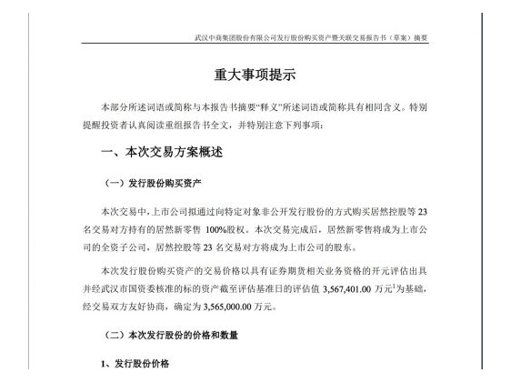 6月3日早間,武漢中商發布公告稱,擬通過向特定對象非公開發行股份的方式購買居然控股等23名交易對方持有的居然新零售100%股權。本次交易完成后,居然新零售將成為上市公司的全資子公司,居然控股等23名交易對方將成為上市公司的股東。