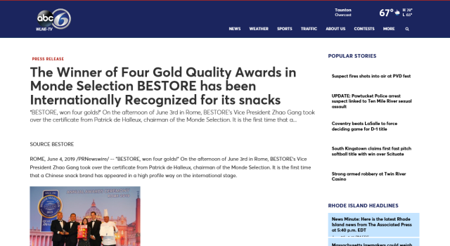 羅馬時間6月3日,在2019世界品質評鑒大會(Monde Selection)頒獎典禮上,中國休閑零食企業良品鋪子斬獲4金13銀6銅的佳績,引發Fox、ABC、Finanzen、每日先驅報等多家外媒競相報道。
