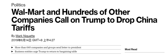 美國彭博社消息:沃爾瑪、梅西百貨等超過640家美國企業和組織聯名給特朗普寫信,要求放棄對中國產品加征更多關稅,盡快回到談判桌上與北京達成協議。