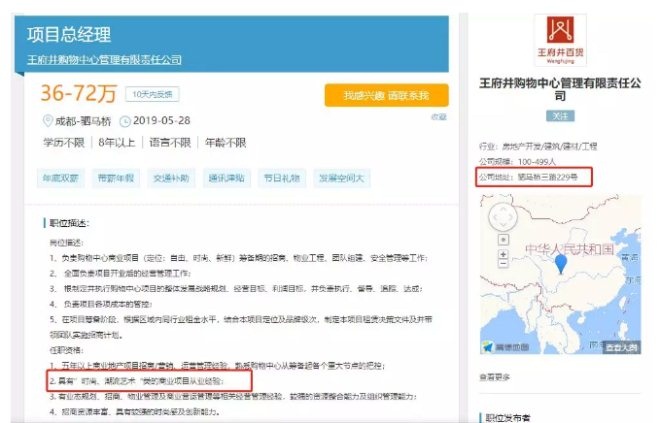 同時,我們從招聘網(wǎng)站上可以再次確認(rèn)入駐消息及摸索出項目的基本方向。現(xiàn)今獵聘網(wǎng)上依舊可以搜索到王府井購物中心管理有限責(zé)任公司招聘從“項目總經(jīng)理”、“招商總監(jiān)”、“行政人事經(jīng)理”等多個權(quán)重職位。注意其中的“公司地址“位置與永立·星城都項目位置相符。