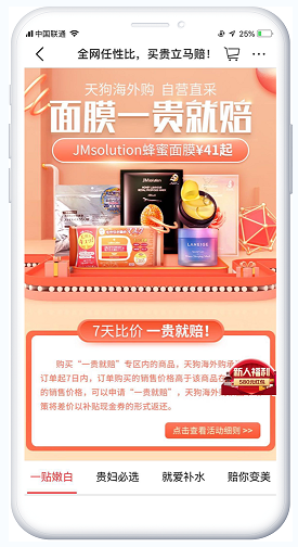 為更好的豐富天狗用戶的購物體驗,提升天狗網品牌的影響力。天狗海外購網羅品牌商資源,設置 “面膜一貴就賠”專區——在天狗海外購特定專區選購面膜商品,天狗網承諾用戶支付訂單起7日內,凡購買價格高于該商品在其他渠道的,可以申請“一貴就賠”,天狗海外購將依據政策以補貼現金券的形式返還差價,切實做到讓用戶大膽購,放心購。