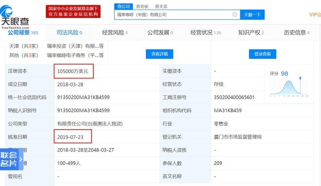 瑞幸咖啡注冊資本增至10.5億美元,經營范圍新增服裝零售等