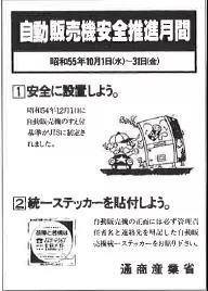 自販機(jī)致人死亡事件,在行業(yè)發(fā)展十年間發(fā)生數(shù)起,通產(chǎn)省及地方政府部門不僅下發(fā)了“確保自販機(jī)安全”的通知及管理?xiàng)l例,還將每年十月作為“自販機(jī)安全月”,與行業(yè)共同推動(dòng)、提高對(duì)安全的重視程度。