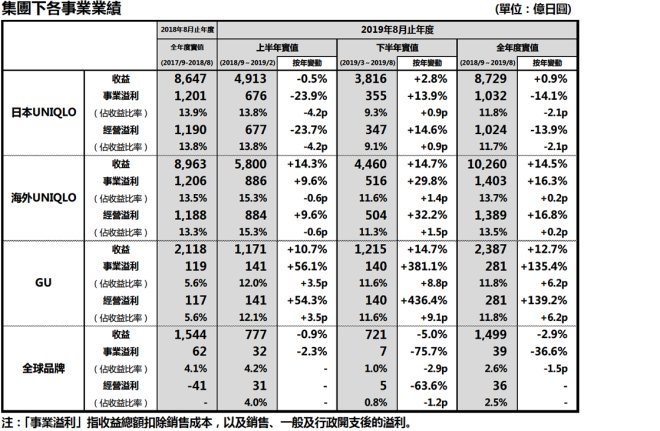 10月10日,優衣庫母公司迅銷集團公布截至2019年8月31日止年度業績,根據公告,2019年優衣庫實現實現營收2.3萬億日元,同比增長7.5%;歸屬上市公司凈利潤約1625億日元,同比增長5%。