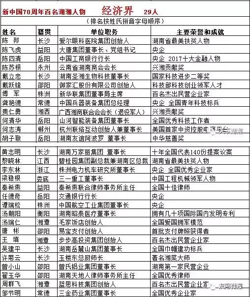 據了解,為更好地學習貫徹習近平同志新時代關于“崇尚英雄模范,爭做先鋒榜樣”的指示精神,全面宣傳推介海內外各界優秀湖湘人物,樹立新時代湖湘榜樣典范,大力弘揚“胸懷天下、敢為人先、勇于擔當”的湖湘精神,本次評審以新中國70周年為契機,于今年5月份發起“尋找共和國70年湖湘人物”活動,并將入選的161位海內外各界湖湘代表名單按照教育、科技、經濟、文體衛、公益慈善等五大領域分類,由高分到低分評選出了“新中國70周年百名湖湘人物”榜單。